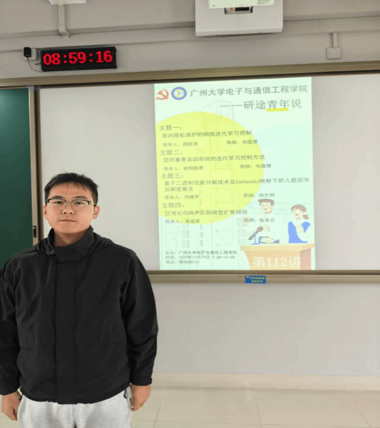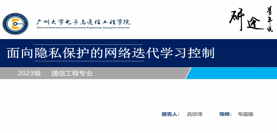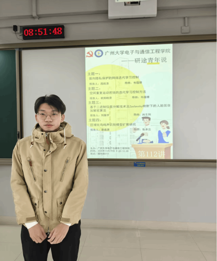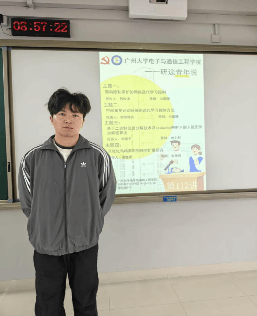 吕欣泽同学介绍的主题是面向隐私保护的网络迭代学习控制。立题基于迭代学习控制在重复任务精确跟踪中的优势,以及网络控制系统的灵活性与资源共享特性,同时针对网络传输中数据丢失、隐私安全等问题,提出将迭代学习控制理论与加密技术结合的解决方案。通过文献调研,他发现双端数据丢失的网络控制系统隐私安全研究存在空缺,核心研究问题包括设计数据丢失补偿的迭代学习控制器、信号加密解密及有效性验证和加密信号的算法设计。研究创新点在于用伯努利随机变量表征数据传输状态,结合多种技术提出加密信号的算法等,后续将围绕量化误差、密码参数设置和数据丢失补偿展开理论研究。