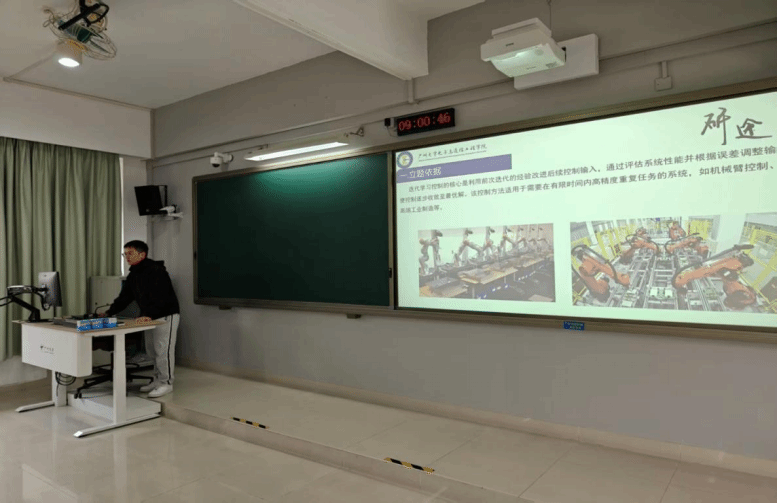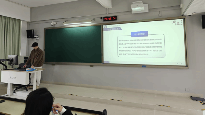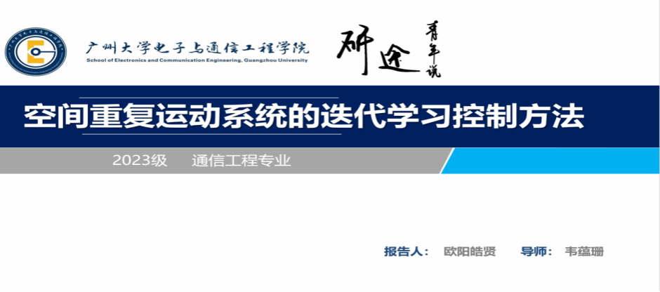 欧阳皓贤同学介绍的主题是空间重复运动系统的迭代学习控制方法,迭代学习控制能够在有限的时间间隔内处理重复的轨迹跟踪任务。传统的迭代学习控制方法要求被控系统在同一时间间隔内重复运行,但很多实际系统不能满足这一要求。针对这一问题,首先利用空间梯度算子,将基于时间轴的动力学模型转换为基于空间轴的模型,再基于该模型构建合适的李雅普诺夫函数,对控制器进行求解,得到控制器的具体形式。仿真显示该控制方法能够满足在迭代轴上的渐进跟踪。