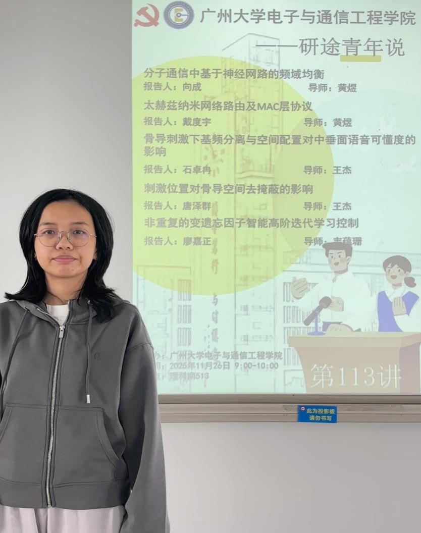 戴度宇同学介绍了太赫兹纳米网络的基本概念与应用前景。针对太赫兹纳米网络中节点移动导致拓扑时变的问题以及低时延/能耗要求,提出了基于速度向量等指标的动态路由(VVBR)协议与跨层媒体访问控制(MAC)协议。VVBR 协议通过实时位置、速度向量分解、剩余能量等多因素加权评估,选择最优中继节点,适配 3D 动态场景;配套 MAC 协议采用时分多址(TDMA)机制,分配专属时隙并引入网络分配向量(NAV),避免数据包冲突。同时进一步讨论基于深度强化学习的路由协议优化方案。