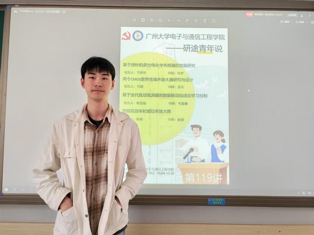 陶婧同学汇报的主题是双频高效率射频功率放大器,她的讲解主要包含以下5个部分:选题背景及意义、现状与研究目标、研究方法及过程、研究结果与应用、总结。研究针对现代无线通信系统调制信号的高峰均比特点及多种无线通信标准共存的特点,融合双频匹配技术和效率提升技术,设计应用于现代无线通信系统的具备双频高效率特点的功率放大器。研究主要包括:1)设计双频阻抗匹配电路同时兼顾双频谐波控制,以实现功率放大器的双频带工作同时提升工作效率;2)将双频匹配技术与异相功率放大器相结合,实现具备双频工作频率的异相功率放大器